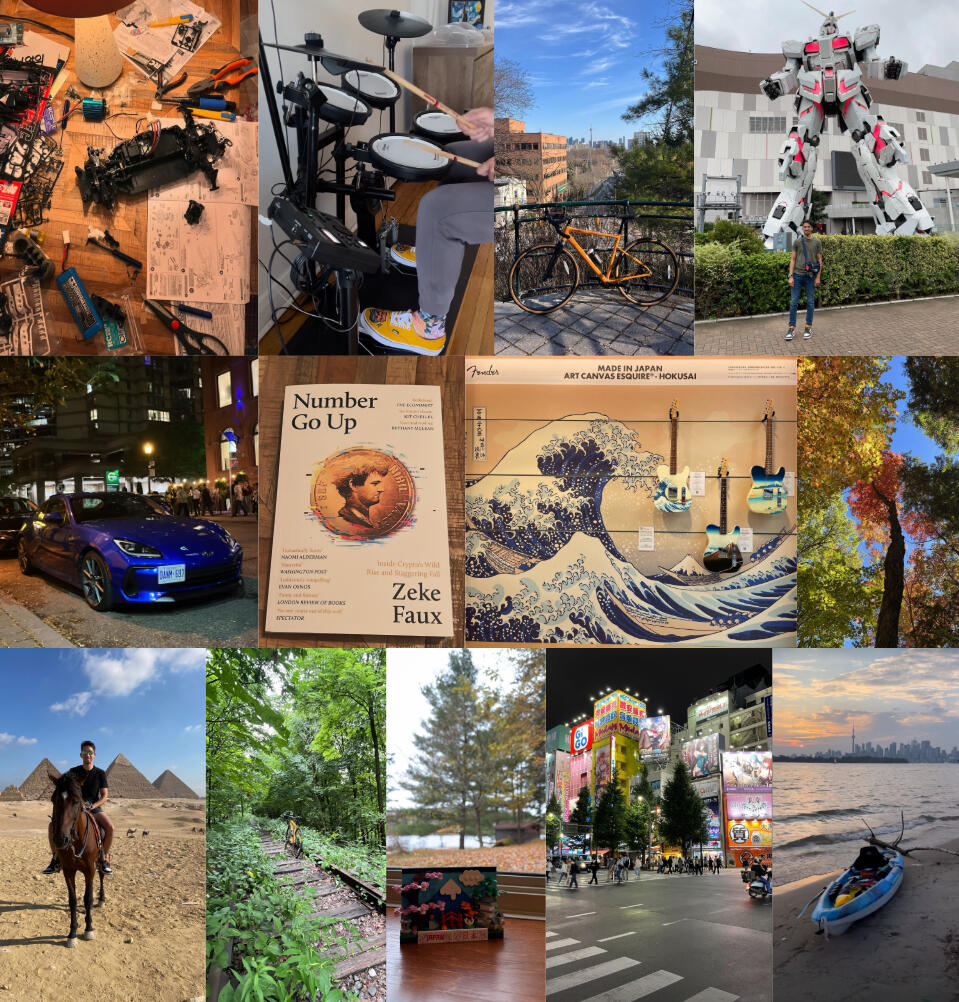 Globetrotting 35+ cities across 4 continents—from the neon of Tokyo and Osaka to the history of Cairo and Berlin. I travel to find new perspectives about our planet and its people.The Library Fuels my curiosity. Number Go Up, Talking to Strangers, and The Bomber Mafia are some of my favorite books.Sound & Rhythm Music feeds my soul. You’ll find me behind a drum kit or picking up a guitar. My playlist is a mix of Foo Fighters, Rock, and the deep tradition of Qawwalis.Tactile Play A lifelong builder—obsessed with the engineering of LEGOs (Starry Night and Pac-Man sets).Model Car Kits: Just like Legos, this is a study in patience and precision. Building complex mechanical systems from 500+ parts is like following the ultimate technical roadmap.The Closer To truly unwind, if I am not grabbing dinner with friends or strangers, I am usually listening to a Podcast on the open road with Lola, my car.